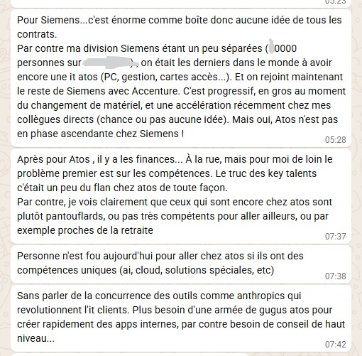 CONCLUSION FATALE SUR SIEMENS : Soyons clairs une bonne fois pour toutes : Siemens quitte Atos, ça n’est pas une prévision, c’est un fait acquis. Le processus de sortie est déjà enclenché et Siemens a même déjà commencé à partir. Pire encore, le géant allemand va passer l’accélérateur dès le mois de juin de cette année. Le compte à rebours est terminé.