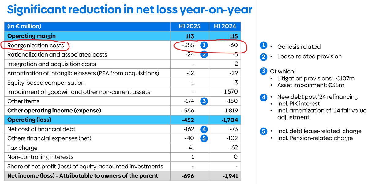 Cependant, même avec les 50 points de base d’erreur, il s’agit d’une marge opérationnelle totalement erronée car brute ou « normalisée » (expression récurrente dans le jargon d’Atos depuis l’arrivée de Thierry Breton en 2008) et qui exclue des charges opérationnelles qui ont été de manière anormale selon les normes IFRS mises en charges exceptionnelles de restructuration du plan Genesis qui lui prévoit des restructurations exceptionnelles uniquement sur les fonctions dites « support ».