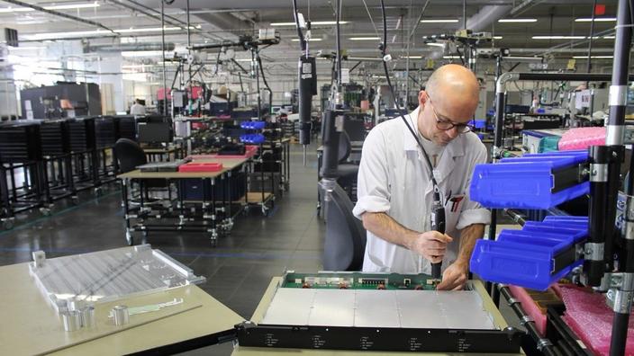 Au cœur de son usine angevine de 28.000 mètres carrés, héritée du rachat de Bull en 2014, s’alignent sur des centaines de mètres, de hautes armoires métalliques (appelées racks). Selon les demandes des clients, elles contiennent chacune plusieurs dizaines de «lames» technologiques, composées de processeurs et de cartes graphiques, le tout assemblé dans la plus grande précision à l’aide de «cobots» qui guident la main de l’homme. «Pour Cineca, un seul rack contient plus de cinq millions de composants et pèse 1,7 tonne», précise Vincent Sarracanie, senior vice président supply chain & manufacturing d’Atos, ce qui nécessite des aménagements spéciaux pour supporter ces poids. Pour répondre aux exigences énergétiques et environnementales toujours plus fortes, un circuit interne de refroidissement à l’eau est capable d’absorber 98 % de la chaleur émise et maintient la température de l’ensemble à 40 °C. Tout doit être ensuite testé dans le moindre détail pendant de longues heures, avant de pouvoir livrer, assembler et ajuster le supercalculateur chez le client final. Certains assemblages se font désormais aussi totalement sur le site d’Angers au sein de conteneurs livrés «prêts à l’emploi» chez le client.