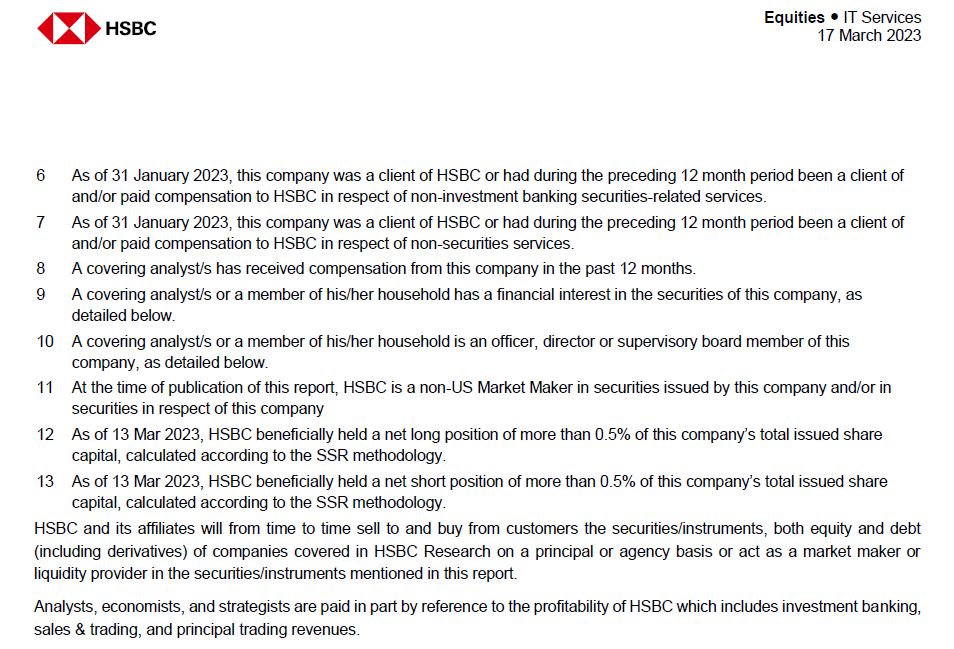 Exemple de conflits d’intérêts des analystes de HSBC, et à quelques nuances près, c’est idem pour les autres analystes.