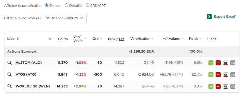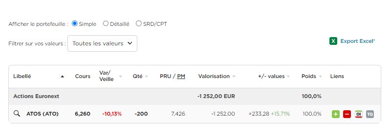 Ce lundi j’ai pris une position short sur 200 titres à l’ouverture, en toute logique avec ma précédente « Recomap » à « vendre » et j’ai renforcé cette position à 500 titres ce soir à la clôture, comme l’atteste cette capture d’écran suite au news flow très négatif sur la valeur.