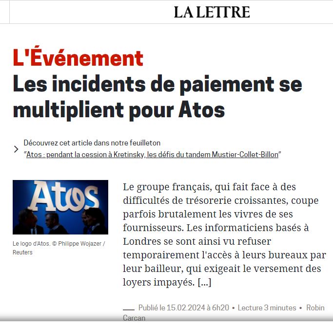 Ce sera un article bref. Nous n’allons pas nous appesantir sur ces problèmes de cahs et tirer sur une ambulance, mais le blog, pour l’instant seul et unique média à avoir alerté en décembre avec son Article intitulé « Hiroshima » indiquant qu’il allait manquer à Atos au moins 1 Md€ dans les caisses. Je rappelle qu’il ne s’agit pas de fuites, mais de simulations, dont nous sommes sûrs à 99.99%. Je rappelle néanmoins que le blog est un blog amateur et que je ne suis pas un professionnel de la finance, même si j’ai quelques bases minimum, à savoir un master en management.